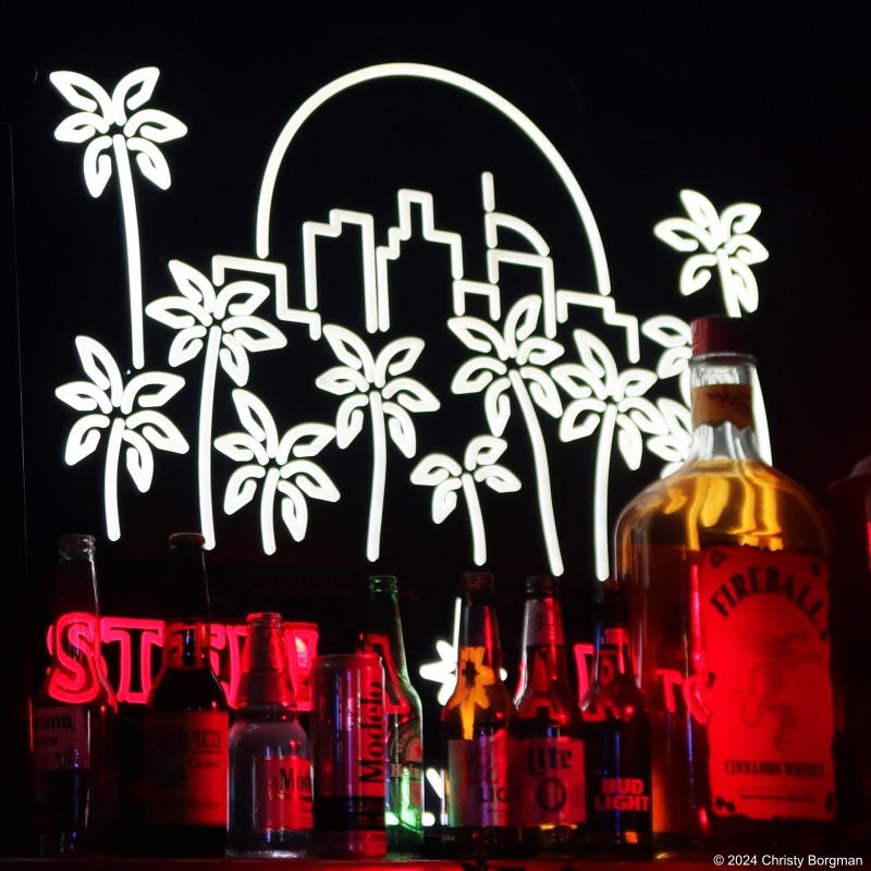 - April 3, 2024 Palm tree neon behind the downstairs inside bar at the Rainbow Bar and Grill in West Hollywood, CA