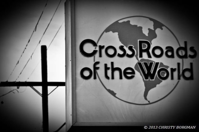 February 3, 2013 Telephone pole cross and Crossroads of the World sign in Hollywood, CA