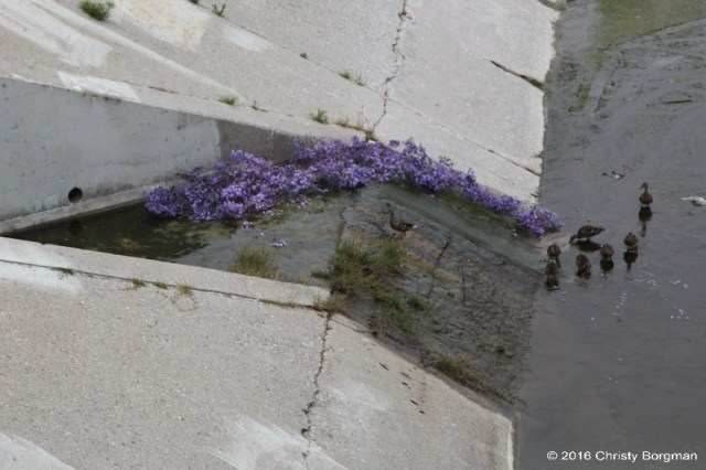 May 29, 2016 Ducks and jacarandas at the petal drop, LA River in Los Angeles, CA