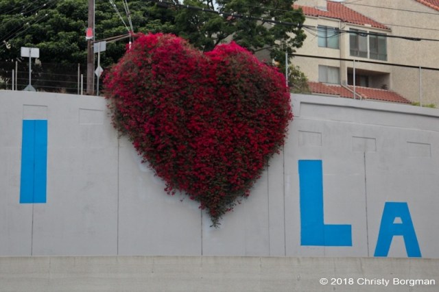 June 16, 2018 I Love LA with heart bougainvillea on the northbound lane of the 101 Freeway near Gower, Hollywood, Los Angeles, CA