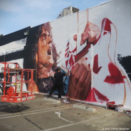 January 19, 2021 Robert Vargas working on his Eddie Van Halen mural at Guitar Center in Hollywood, CA