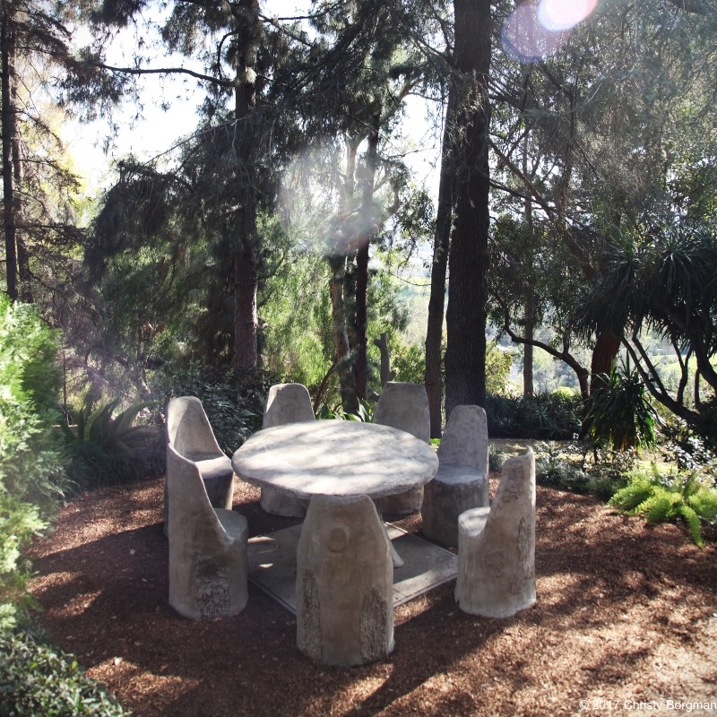 February 4, 2017 Stone seating area at the Self-Realization Fellowship Meditation Gardens in Mt. Washington, Los Angeles, CA